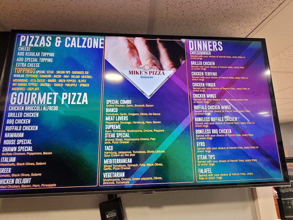 Mike’s Pizza is a place where you can count on consistent, well-prepared food whether you’re dining in, taking out, or having a meal delivered. The comforting aroma of baked dough and melted cheese creates a welcoming atmosphere, perfect for casual meals at any time of day—from midday breaks to evening gatherings.